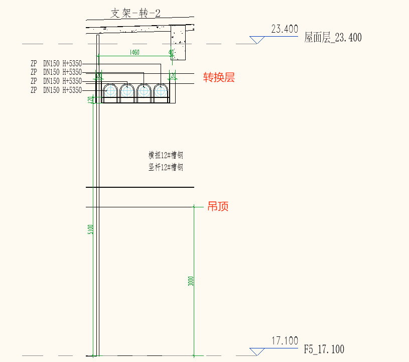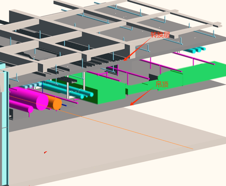 廠房生產車間各層高近0.7m左右,通過設置轉換層進行潔凈室專用吊頂板吊頂。BIM在管線深化時,充分利用轉換層受力特點,部分主管放轉換層利用轉換層受力固定,節省了支架套數;布置在轉換層下方的管道,支吊架固定點設置在轉換層上,縮短支吊架吊桿長度。利用BIM技術整體考慮支吊架深化,做到規劃合理,施工有序。
