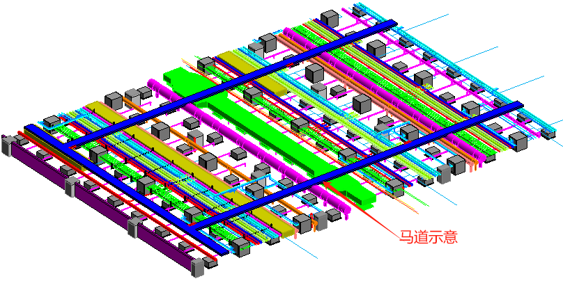 廠房一、三層潔凈生產車間設置鋼格柵板檢修馬道,底部標高距吊頂1m,寬0.9m。BIM深化管線充分利用馬道下方空間,遇到較大風管進行局部變徑處理;局部管道超出馬道底標高0.2m以內處,馬道進行局部緩坡處理。